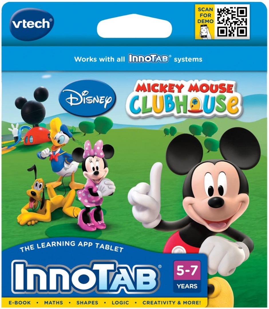 The Mickey Mouse Clubhouse software for the InnoTab Learning App Tablet includes three learning games where players can use the colour touchscreen or tilt sensor to play. Kids will learn skills such as numbers, mathmatics, and shapes. Your child can read along with an e-book that tells the story of Mickey and Donald playing hide-and-seek around the Clubhouse, and a pop-up dictionary feature gives animated definitions of various vocabulary words found in the e-book. Two creative activities allow kids to play and create with Mickey and friends, and creations can be saved on InnoTab's onboard memory or an SD card (not included). This software is compatiable with all InnoTab learning tablets.